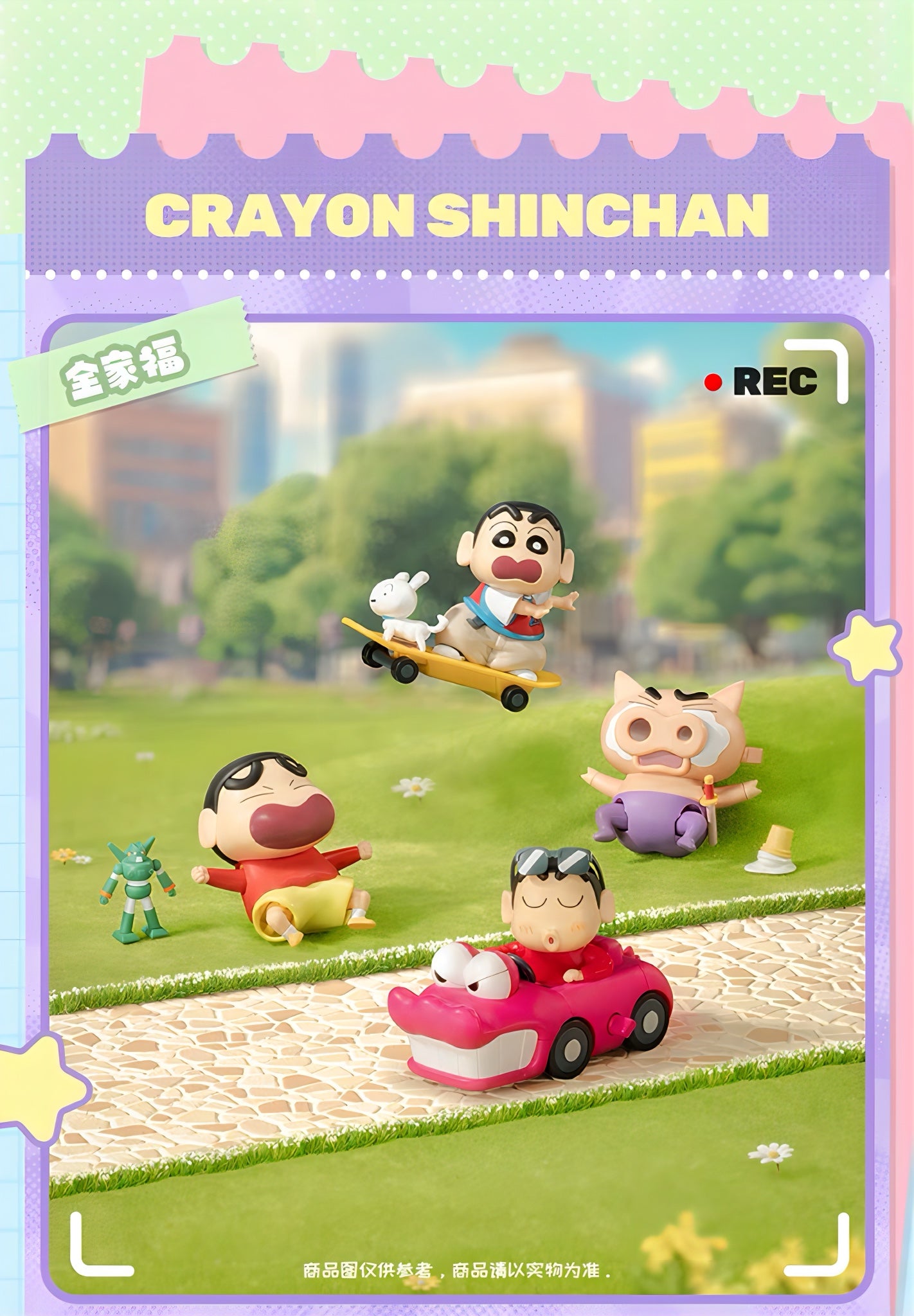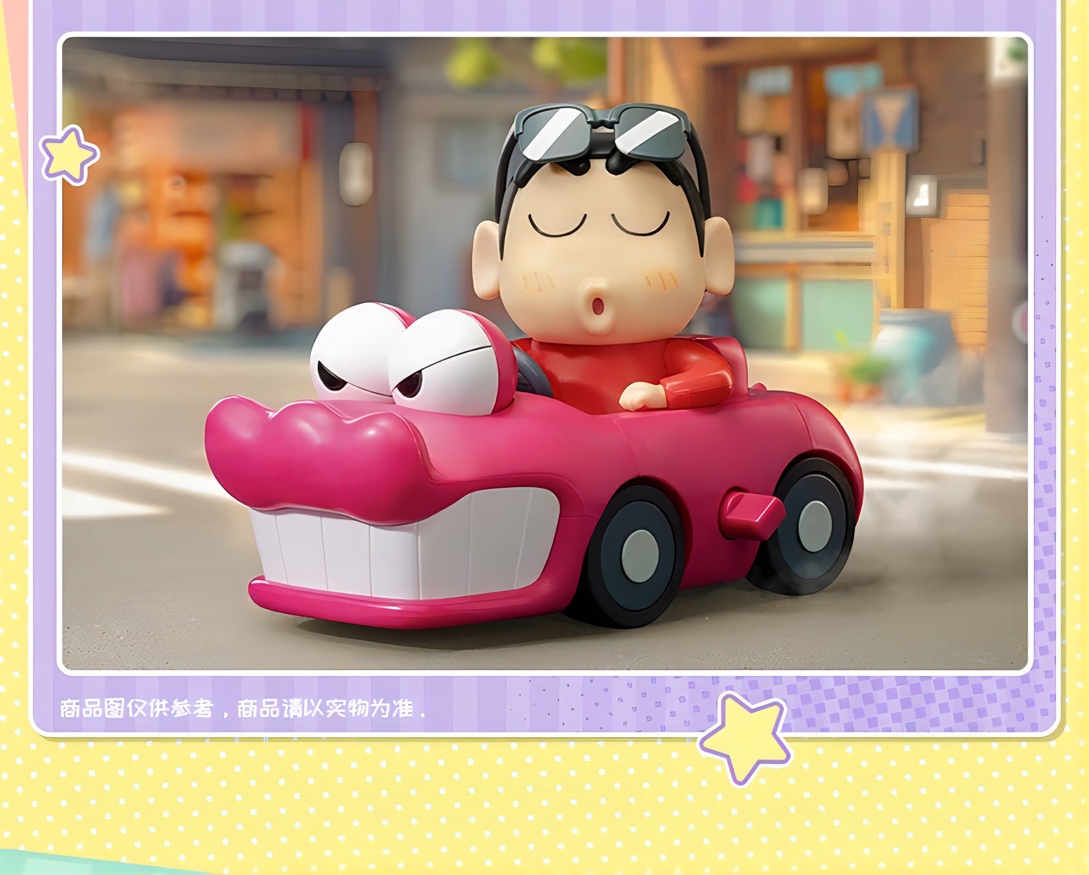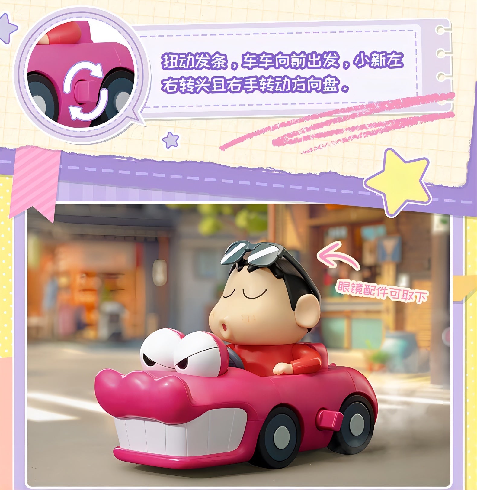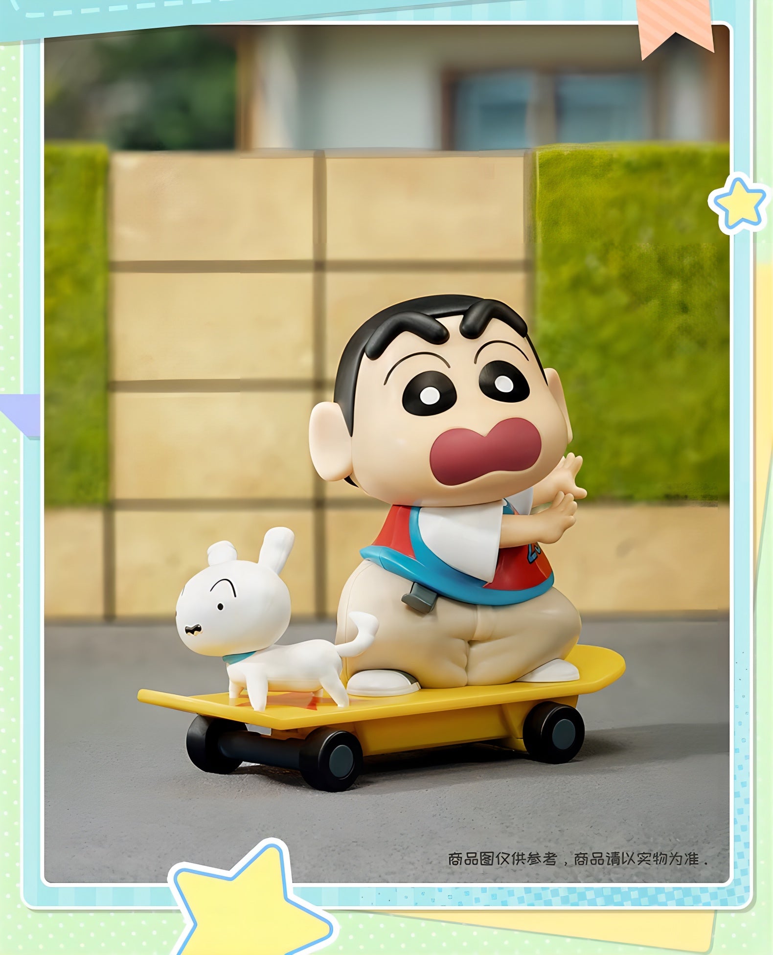 車を回すと前進する「ドライブしんちゃん」や、腕と脚が上下に揺れる「ぶりぶりざえもん」、スケートボードで疾走する「しんちゃん&シロ」など、動かして遊べる仕様が魅力です。