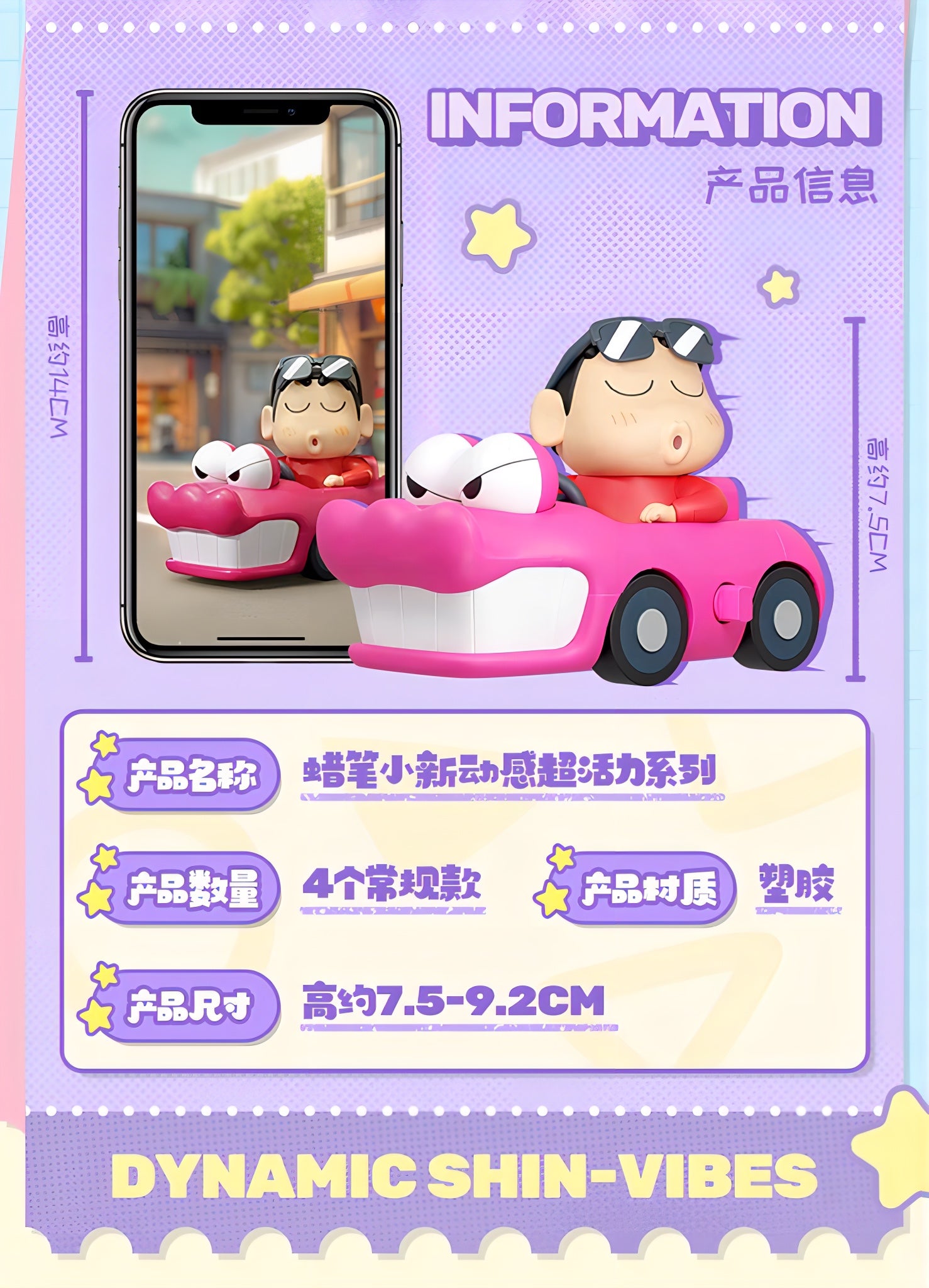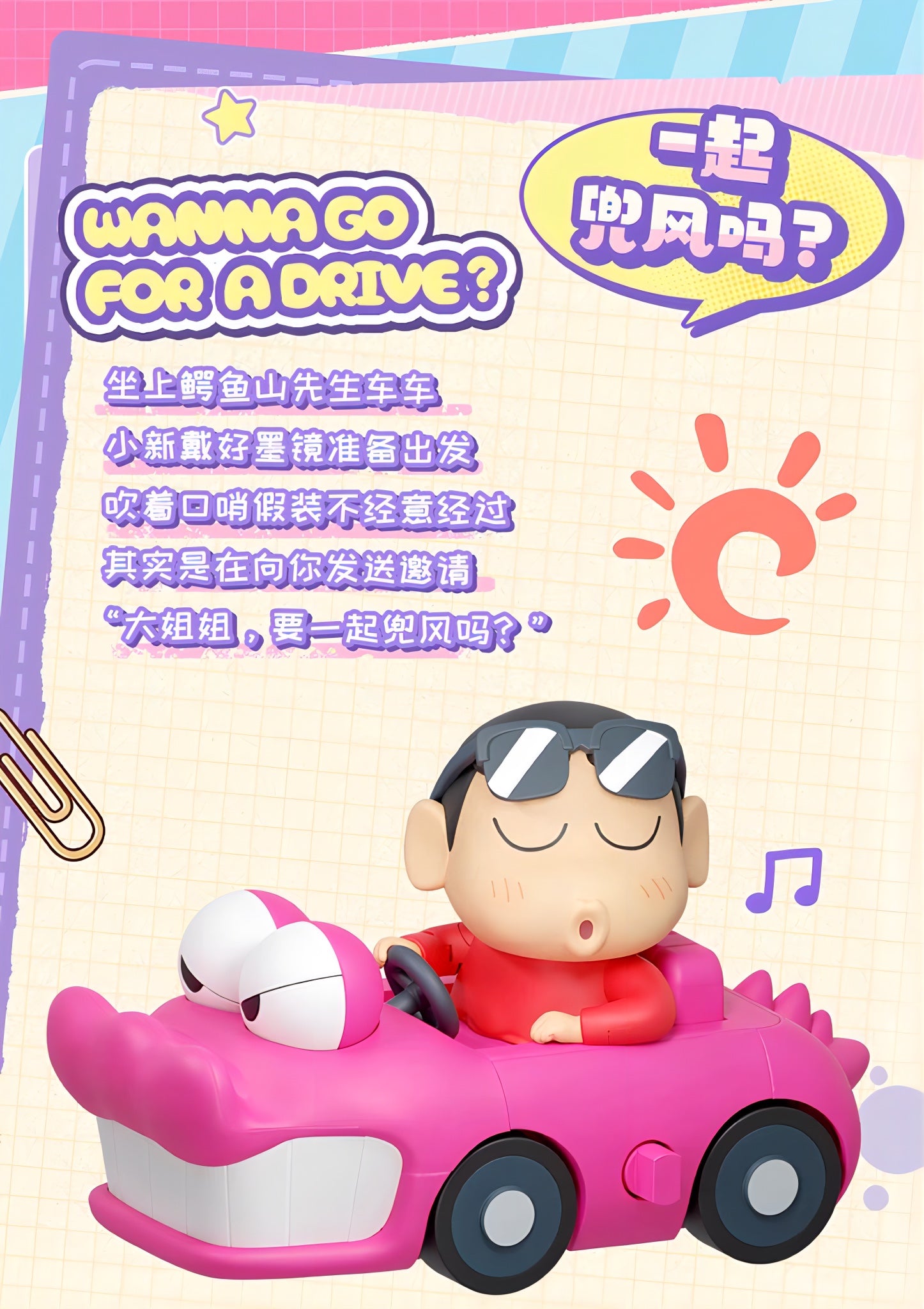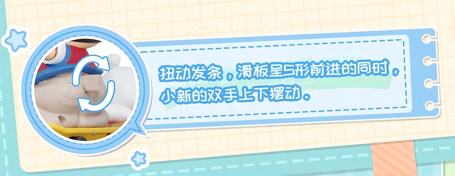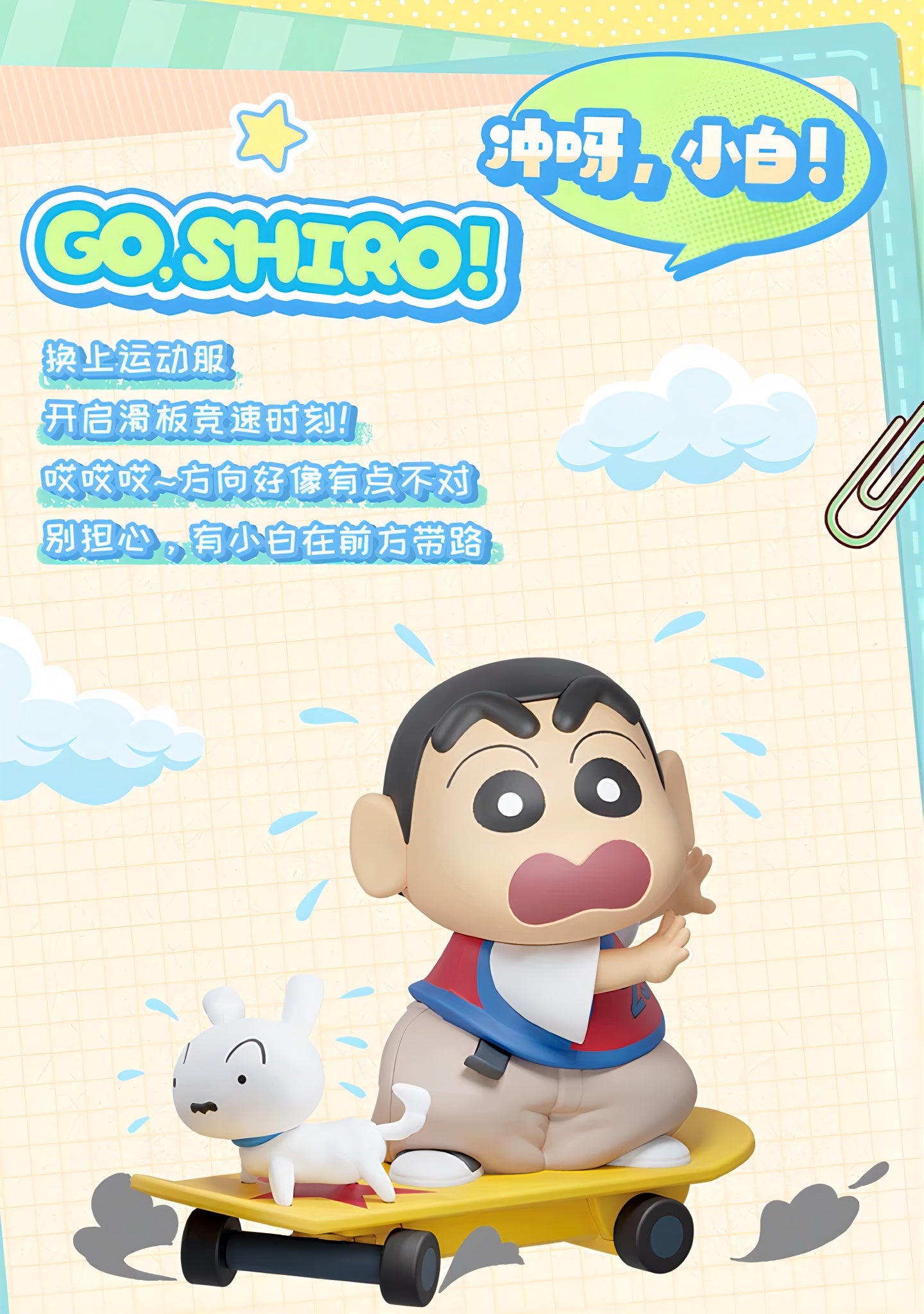 車を回すと前進する「ドライブしんちゃん」や、腕と脚が上下に揺れる「ぶりぶりざえもん」、スケートボードで疾走する「しんちゃん&シロ」など、動かして遊べる仕様が魅力です。