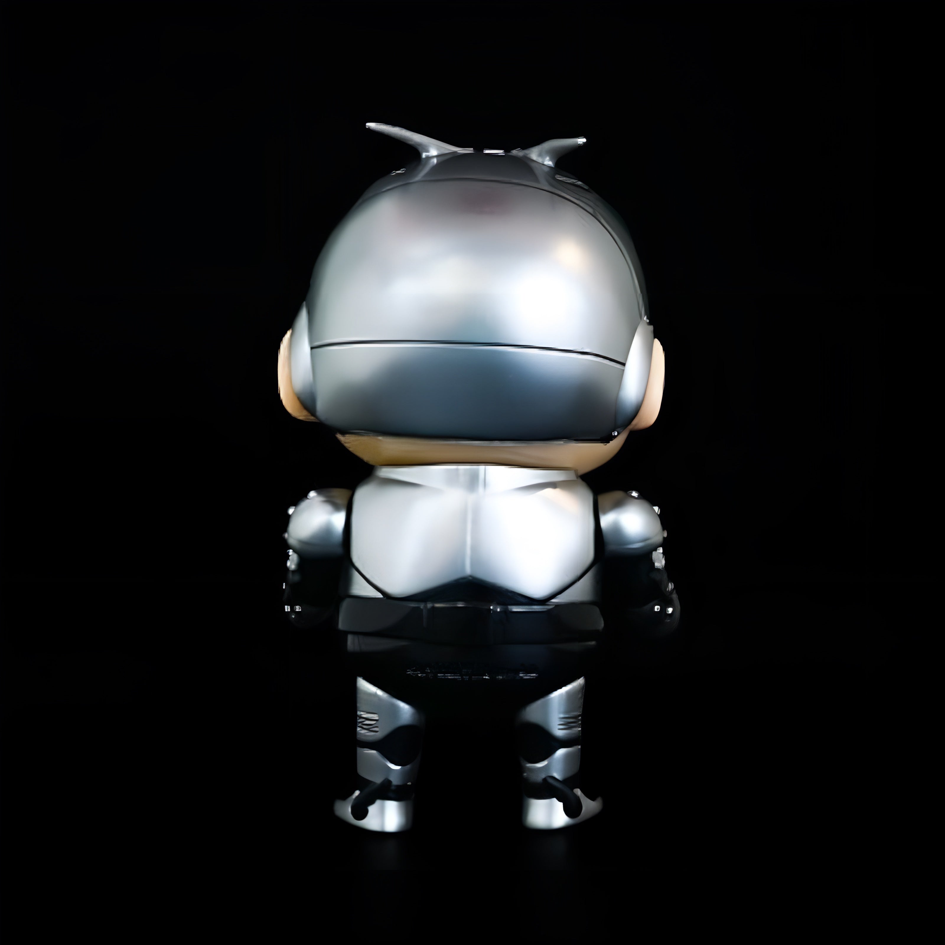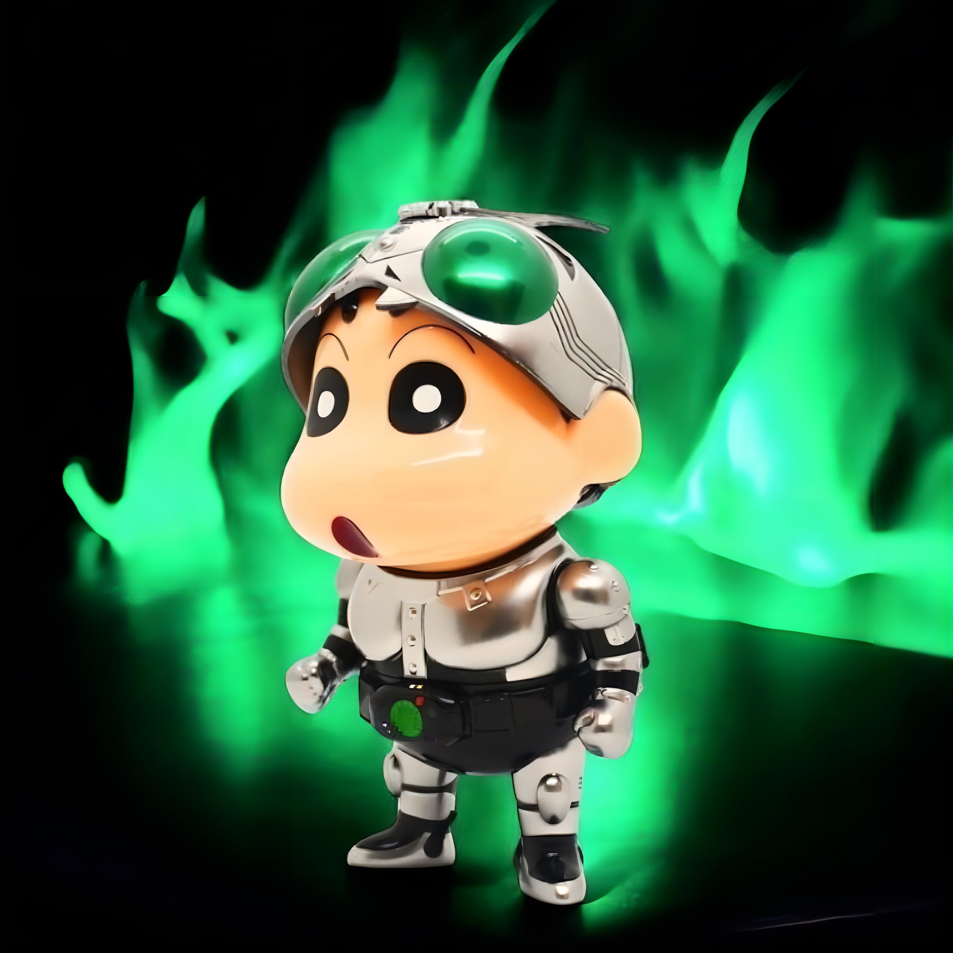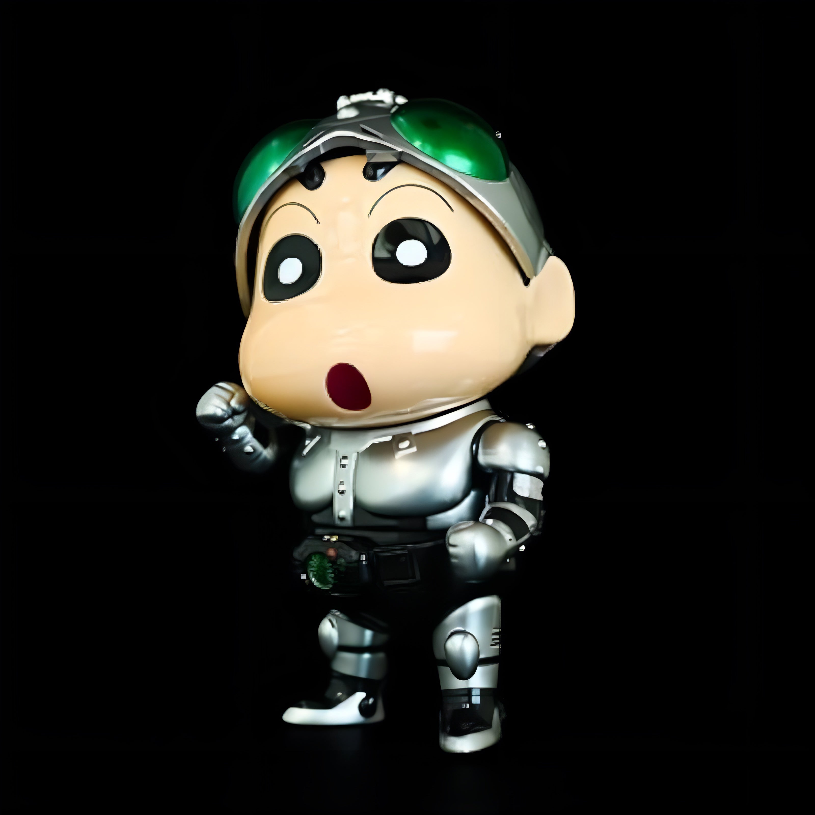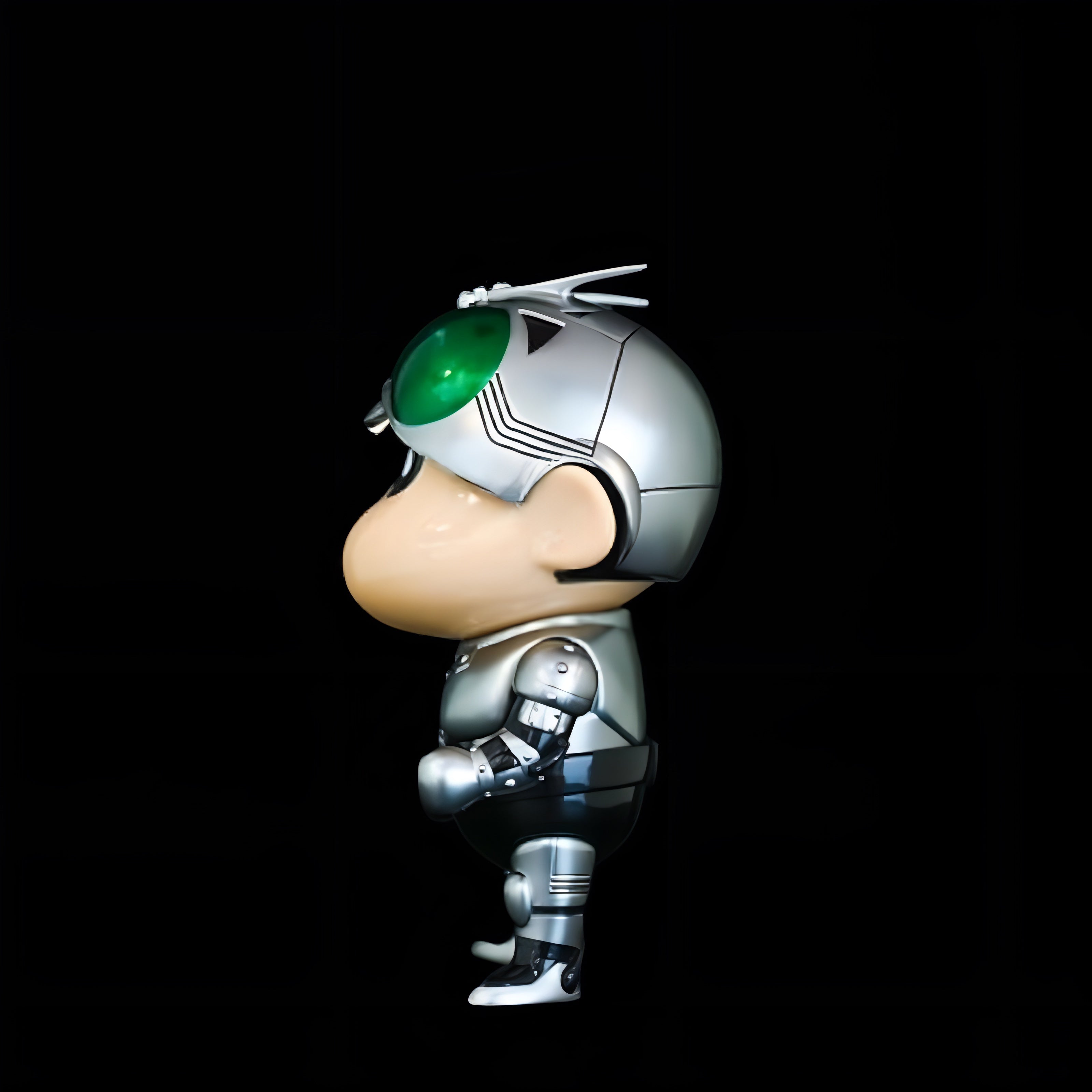 シャドームーンの特徴的なメタリックボディと、しんちゃんのユーモラスな表情が融合した独創的なデザインです。