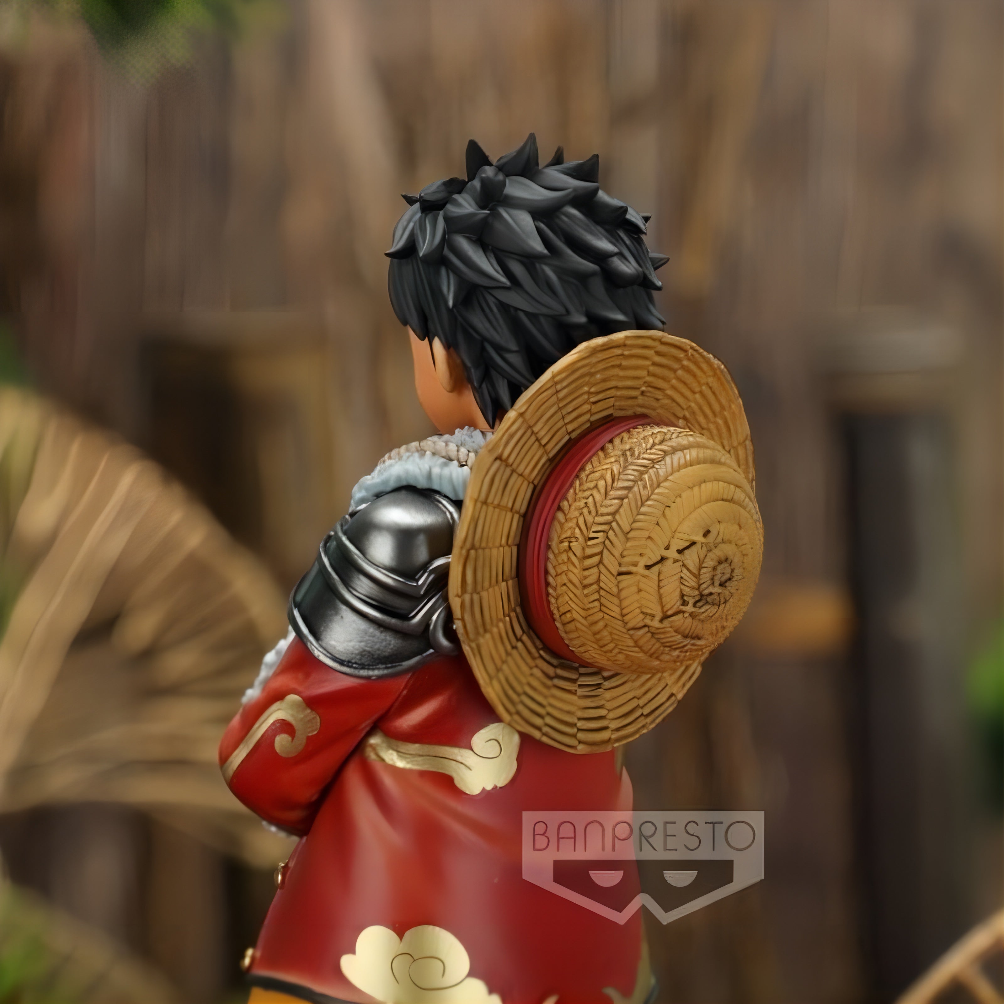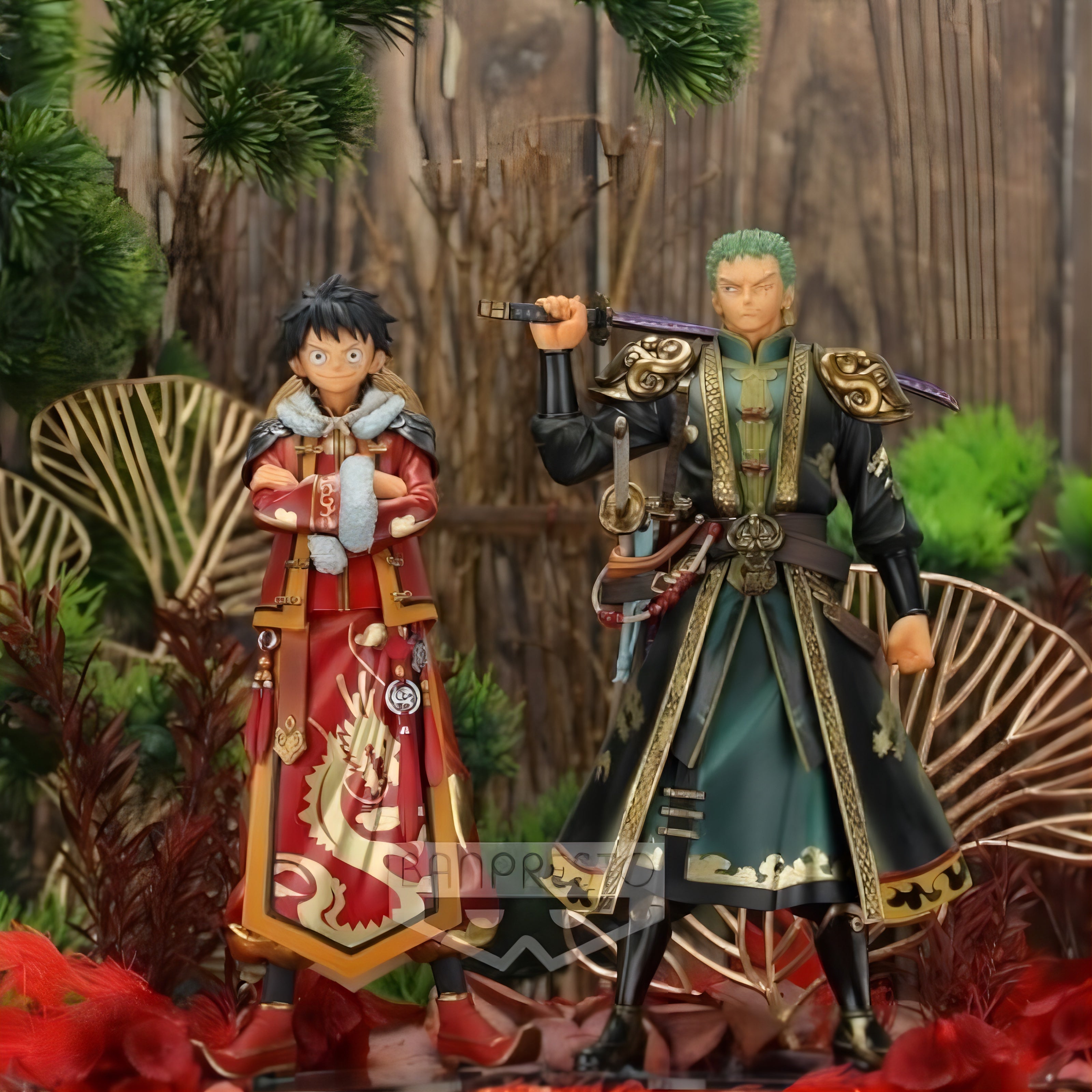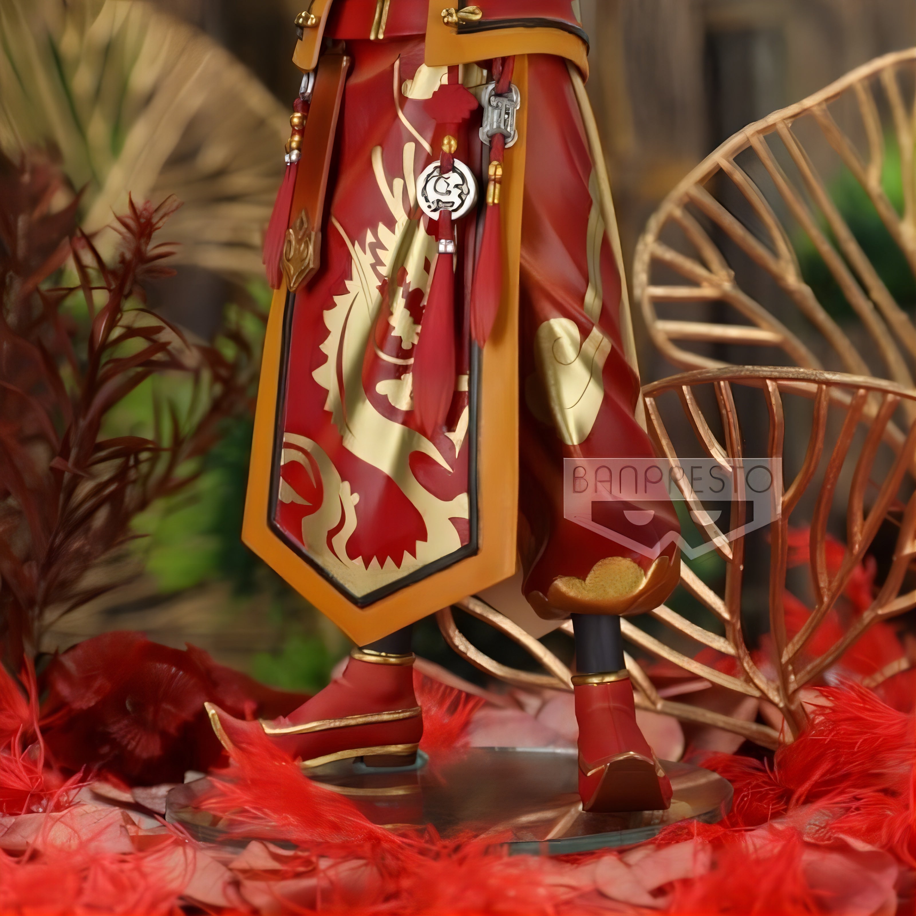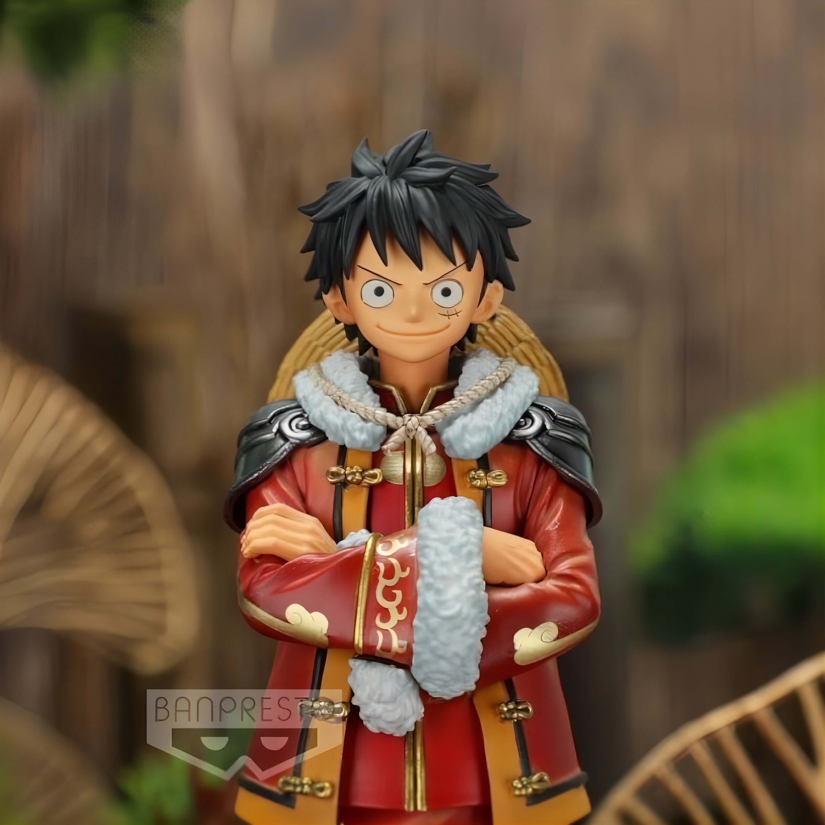 中国限定仕様として登場した特別なルフィフィギュア。金色の龍が描かれた豪華な赤い衣装を纏い、腕を組んで堂々と立つ姿を精巧に再現。毛皮の装飾や和の意匠が随所に施され、高級感と威厳を兼ね備えた仕上がりです。ゾロと並べて飾ることで、中国限定版ならではの特別感あるディスプレイが楽しめます。