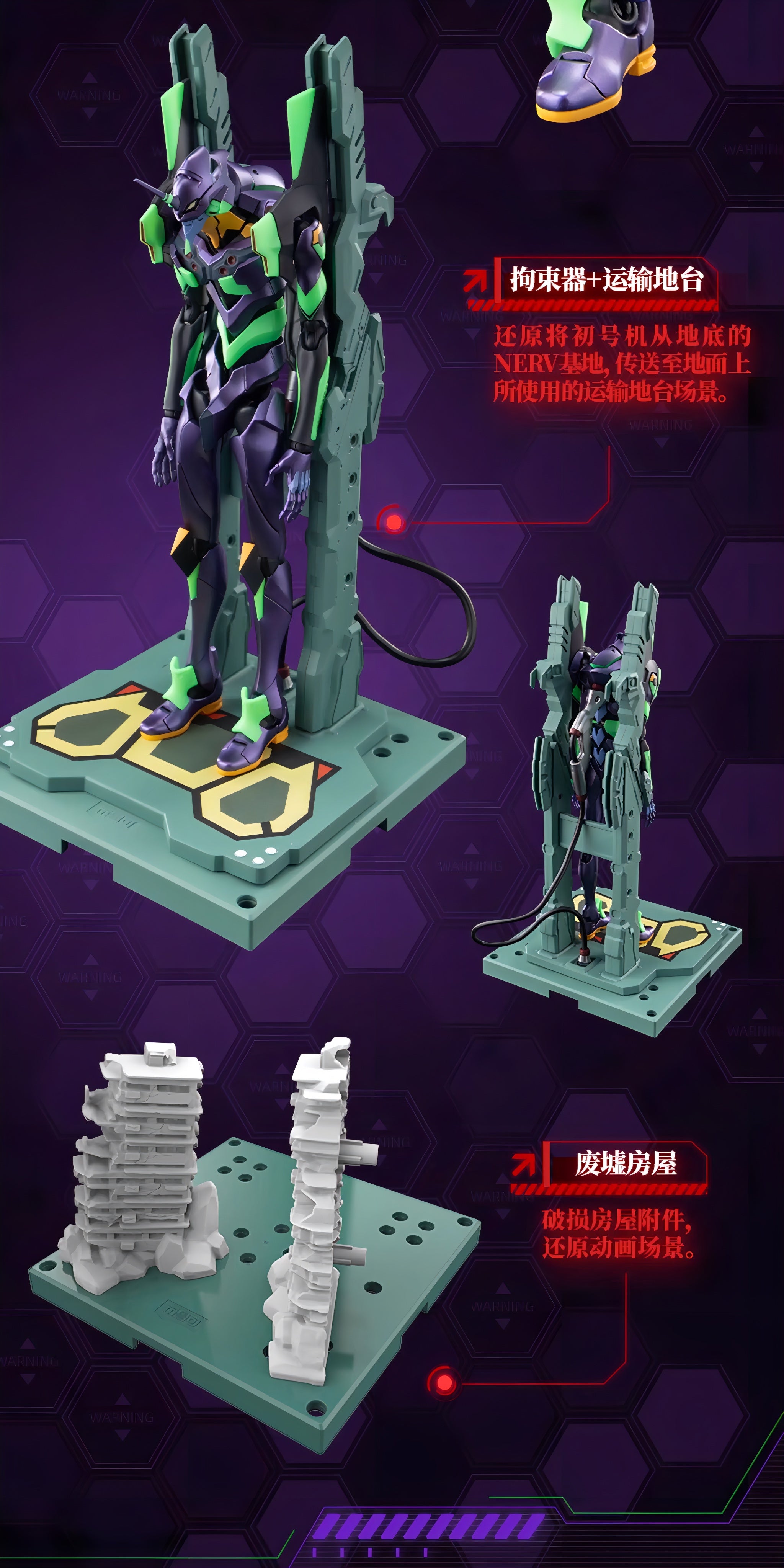 拘束器+輸送台や廃墟ビルディオラマもセットになり、NERV基地からの射出台シーンなど名場面を再現可能。