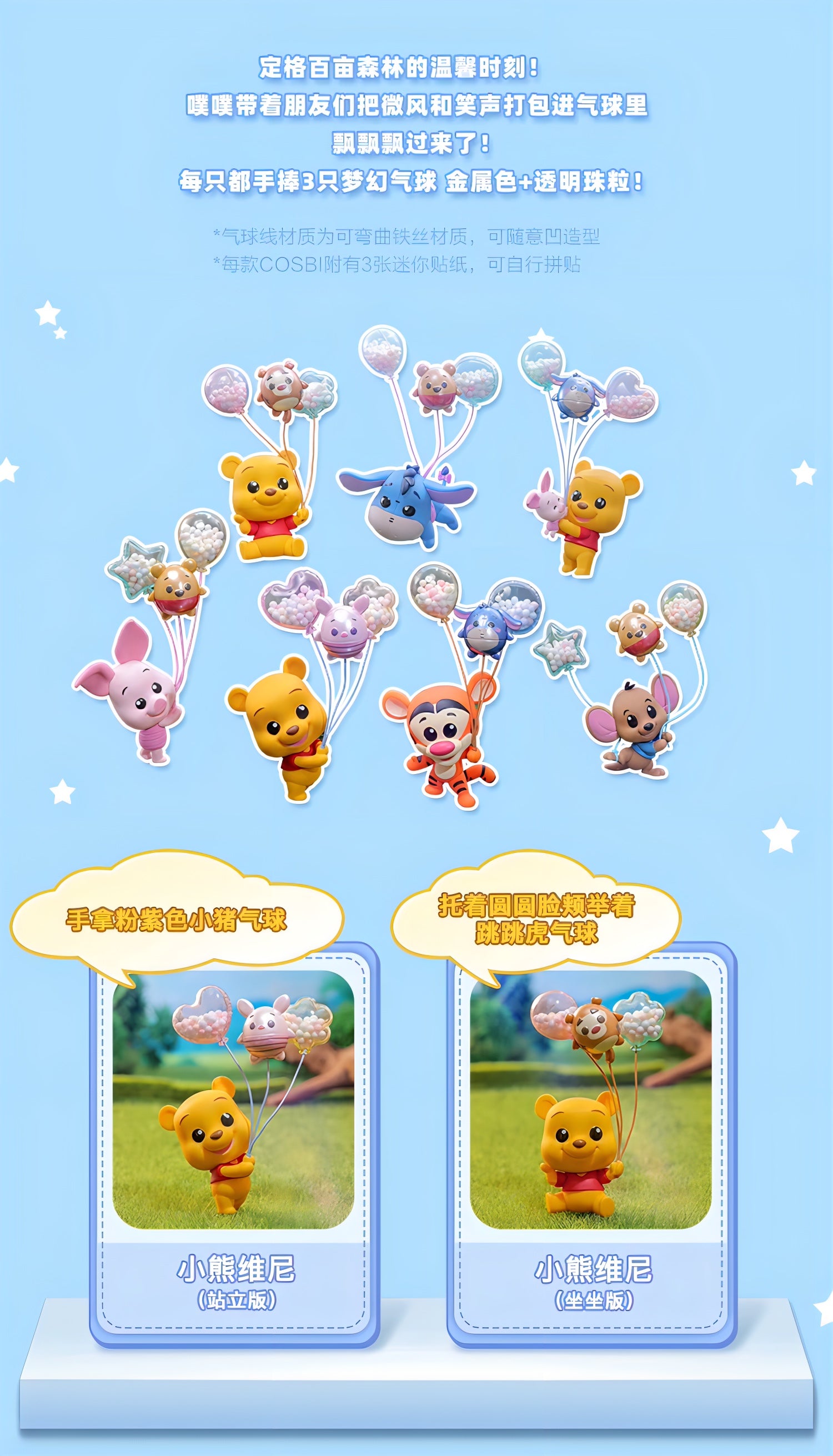 くまのプーさんの仲間たちが、カラフルなビーズ入りバルーンと一緒にCOSBIになって登場。ふんわりした世界観と透明感のあるバルーン表現で、飾るだけで空間が明るくなるブラインドボックスシリーズです。