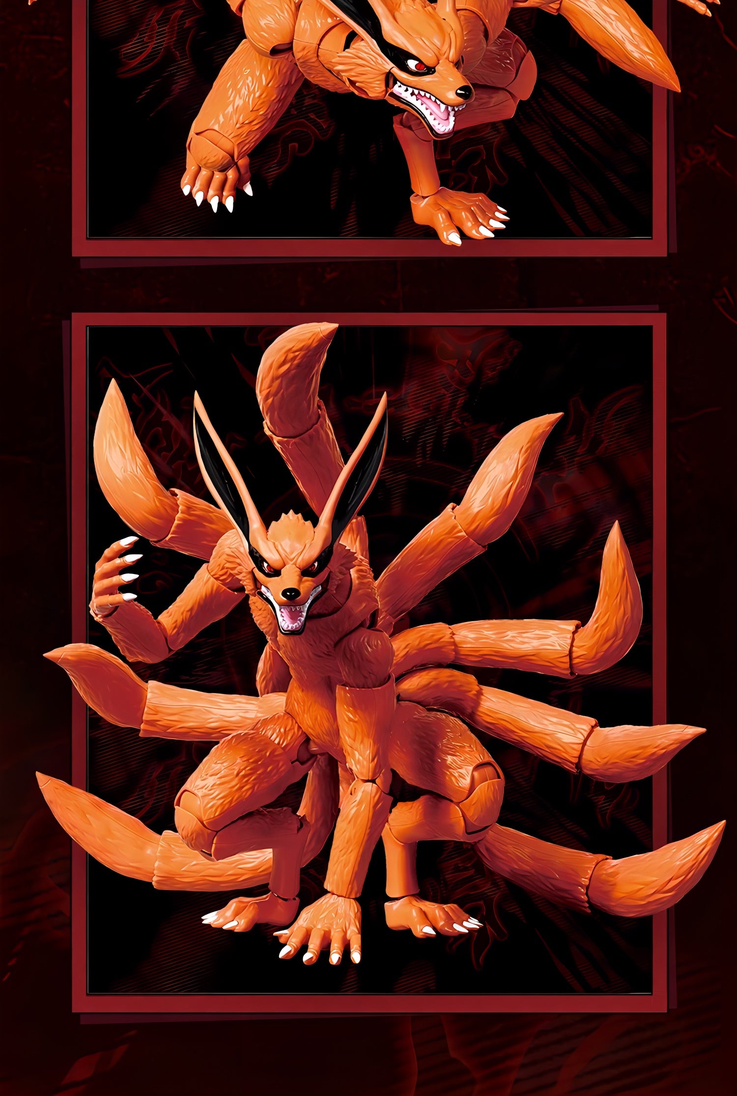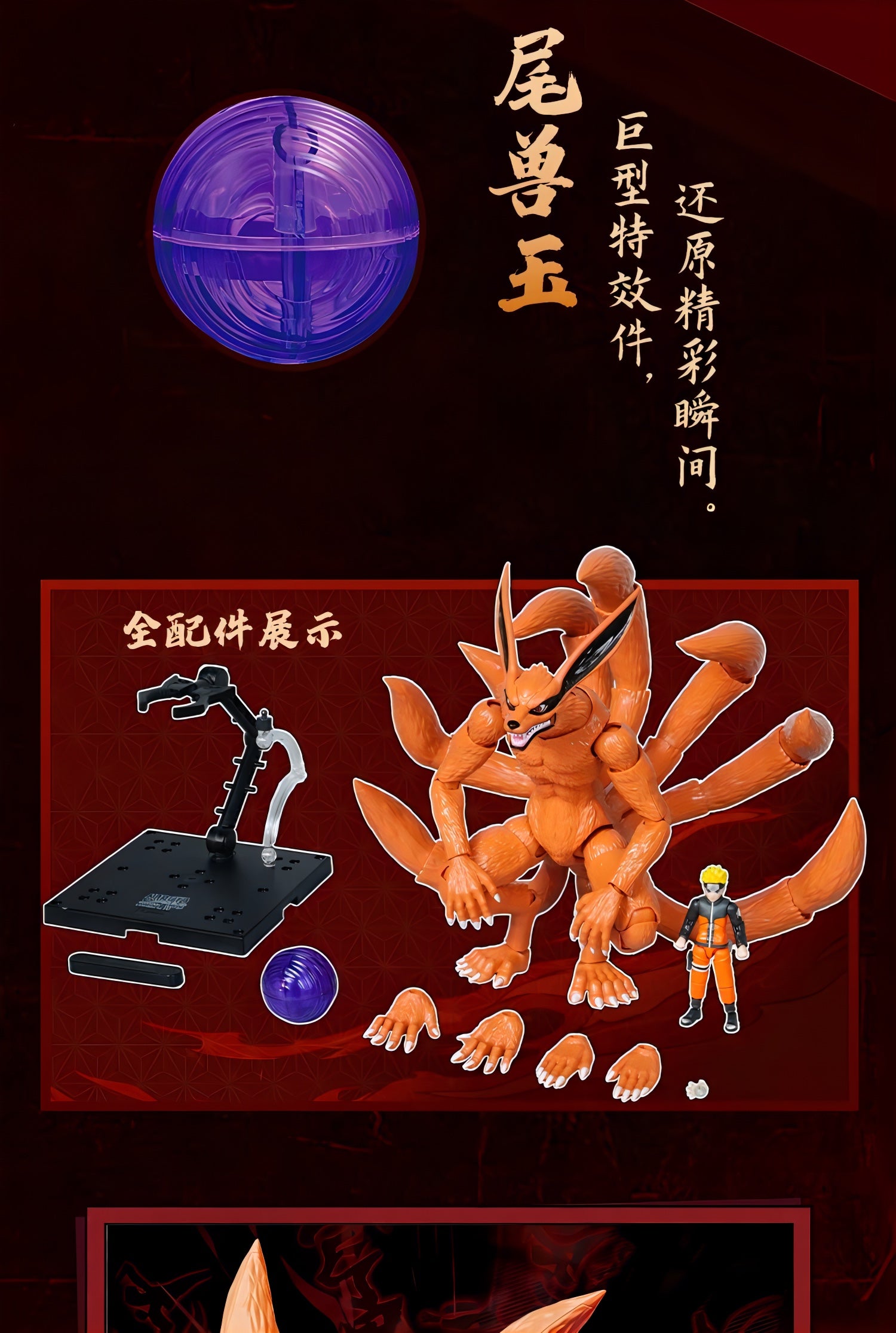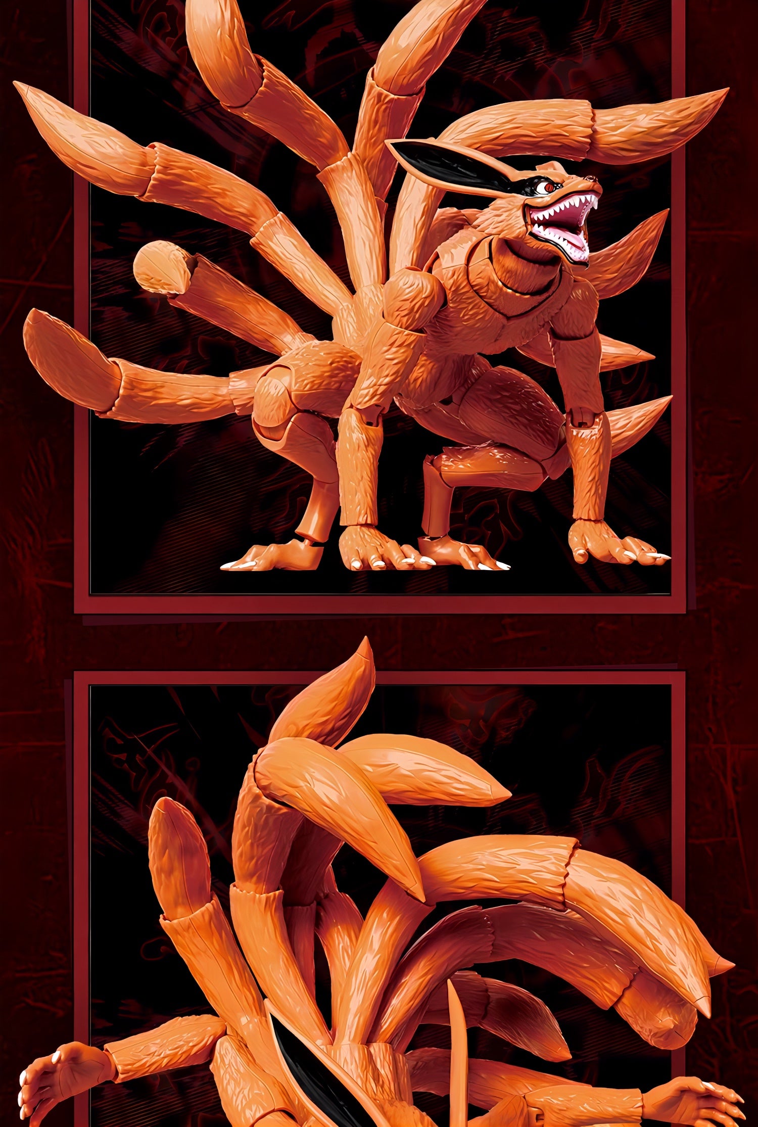 九尾は9本の尾それぞれが独立可動し、うねり・立ち・攻撃など自由度の高いアクションが可能。さらに磁力による"目の発光ギミック"を搭載し、封印空間を思わせる劇中の雰囲気を再現できます。