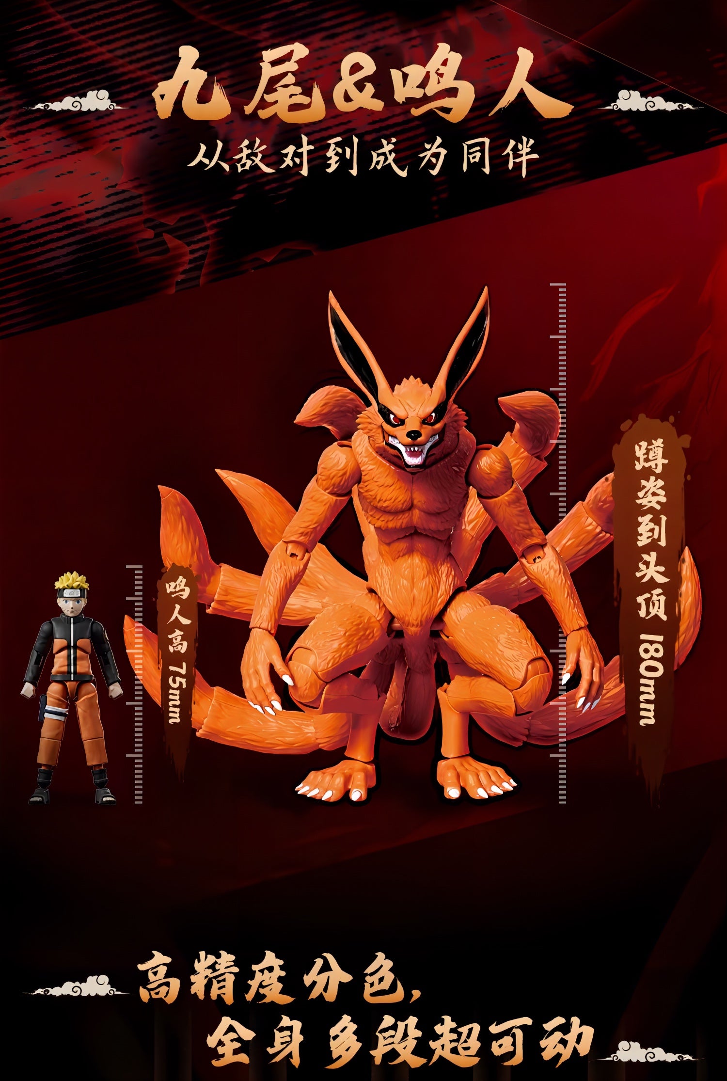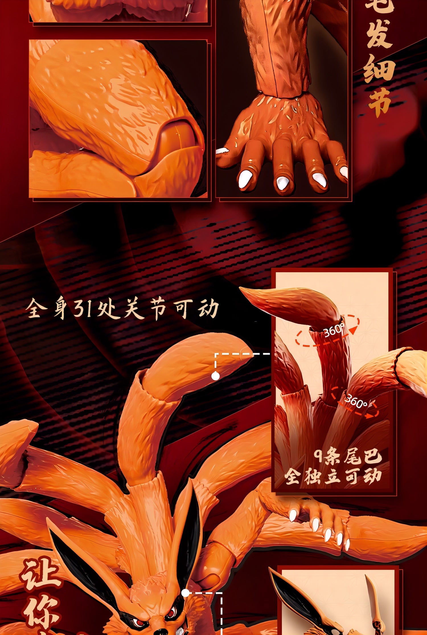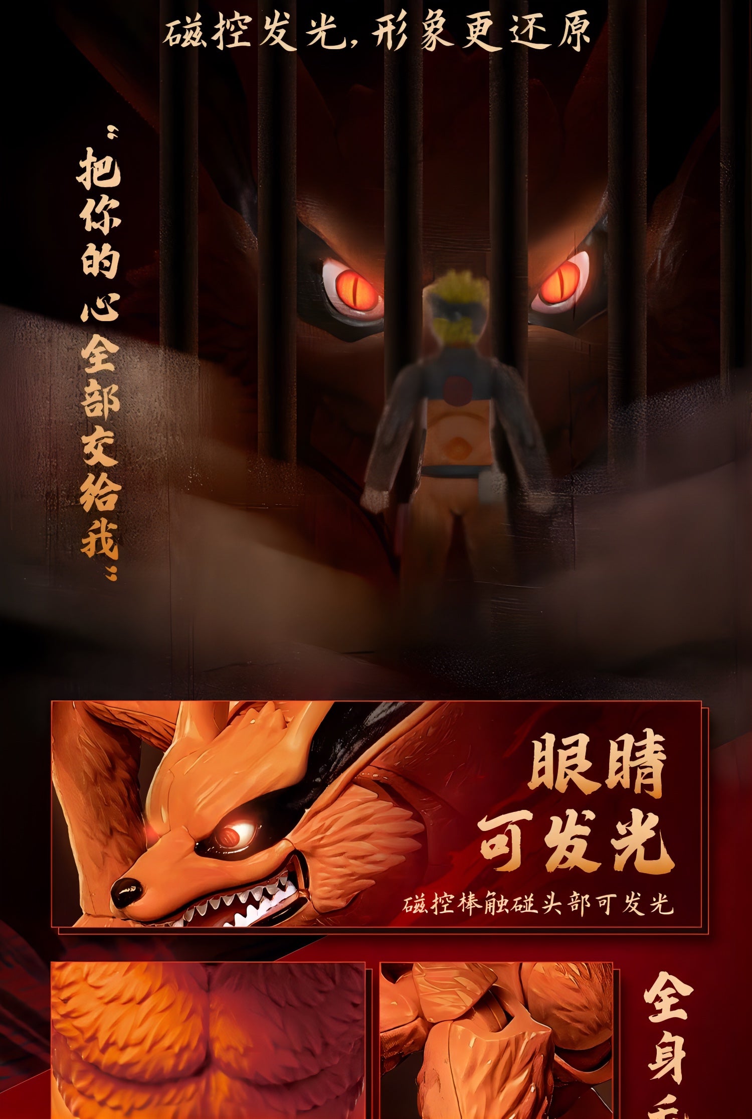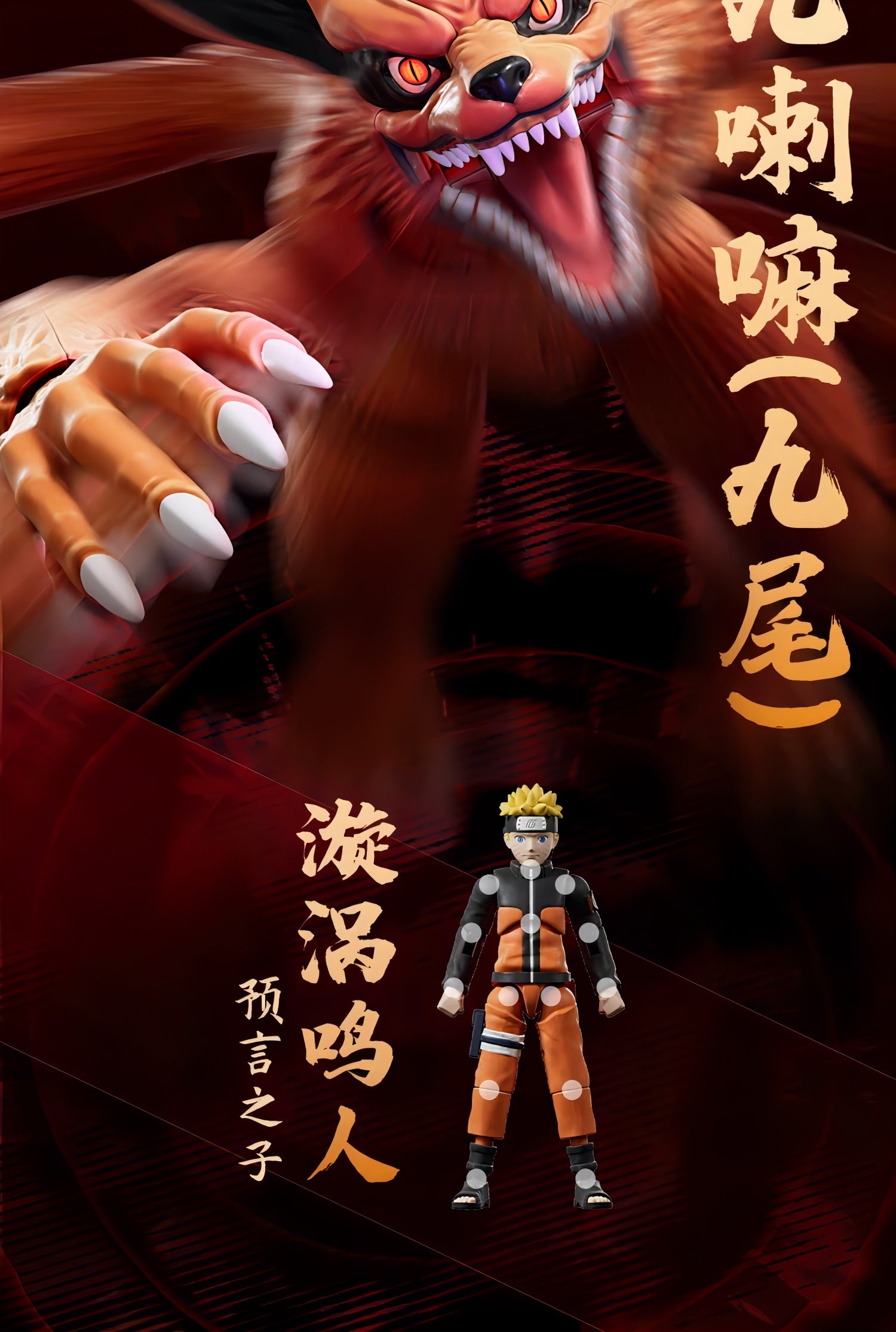 九尾は9本の尾それぞれが独立可動し、うねり・立ち・攻撃など自由度の高いアクションが可能。さらに磁力による"目の発光ギミック"を搭載し、封印空間を思わせる劇中の雰囲気を再現できます。