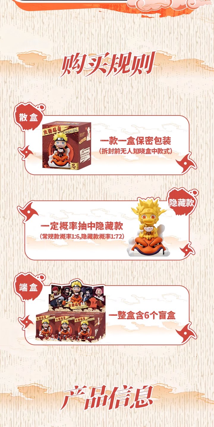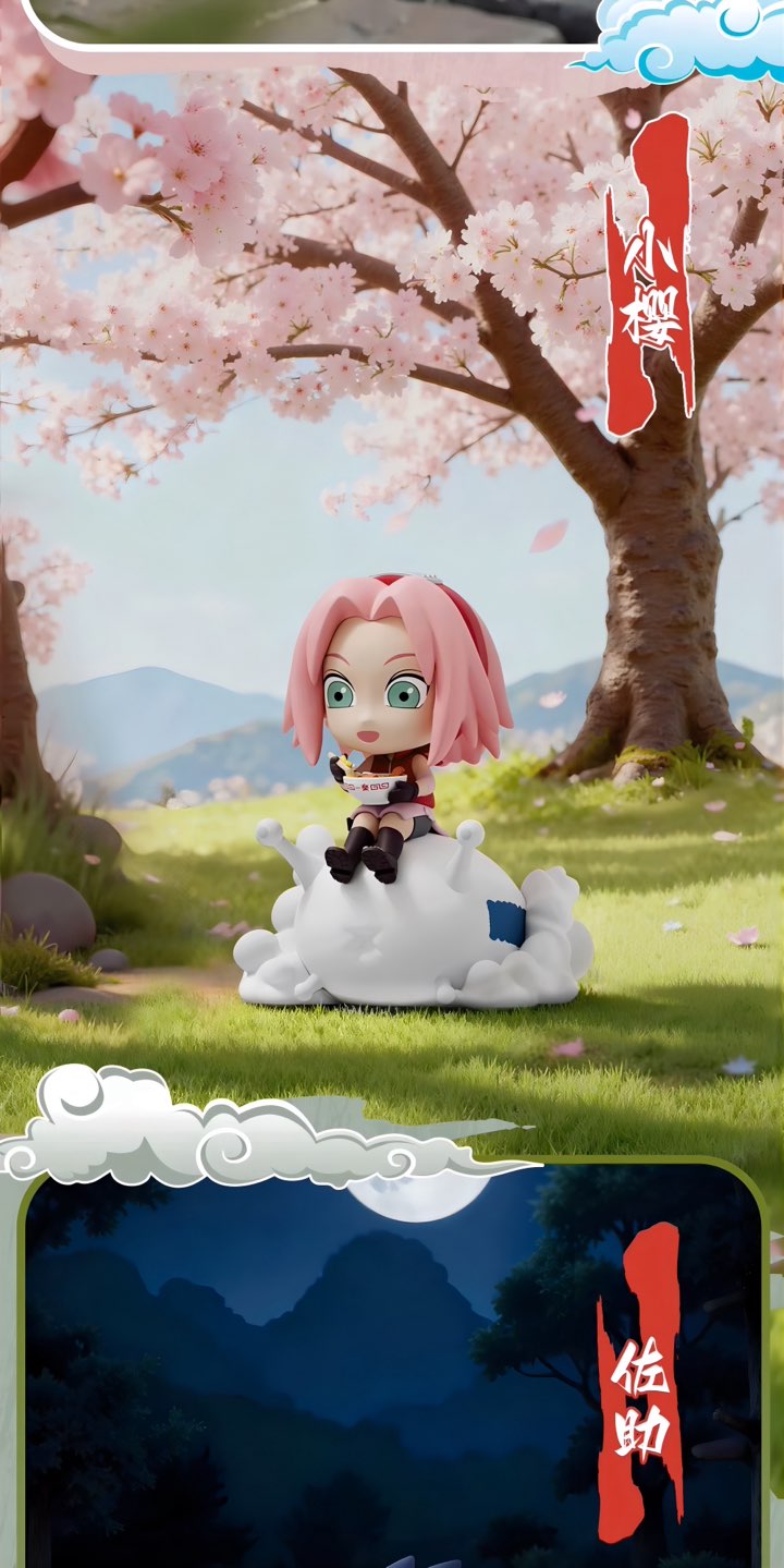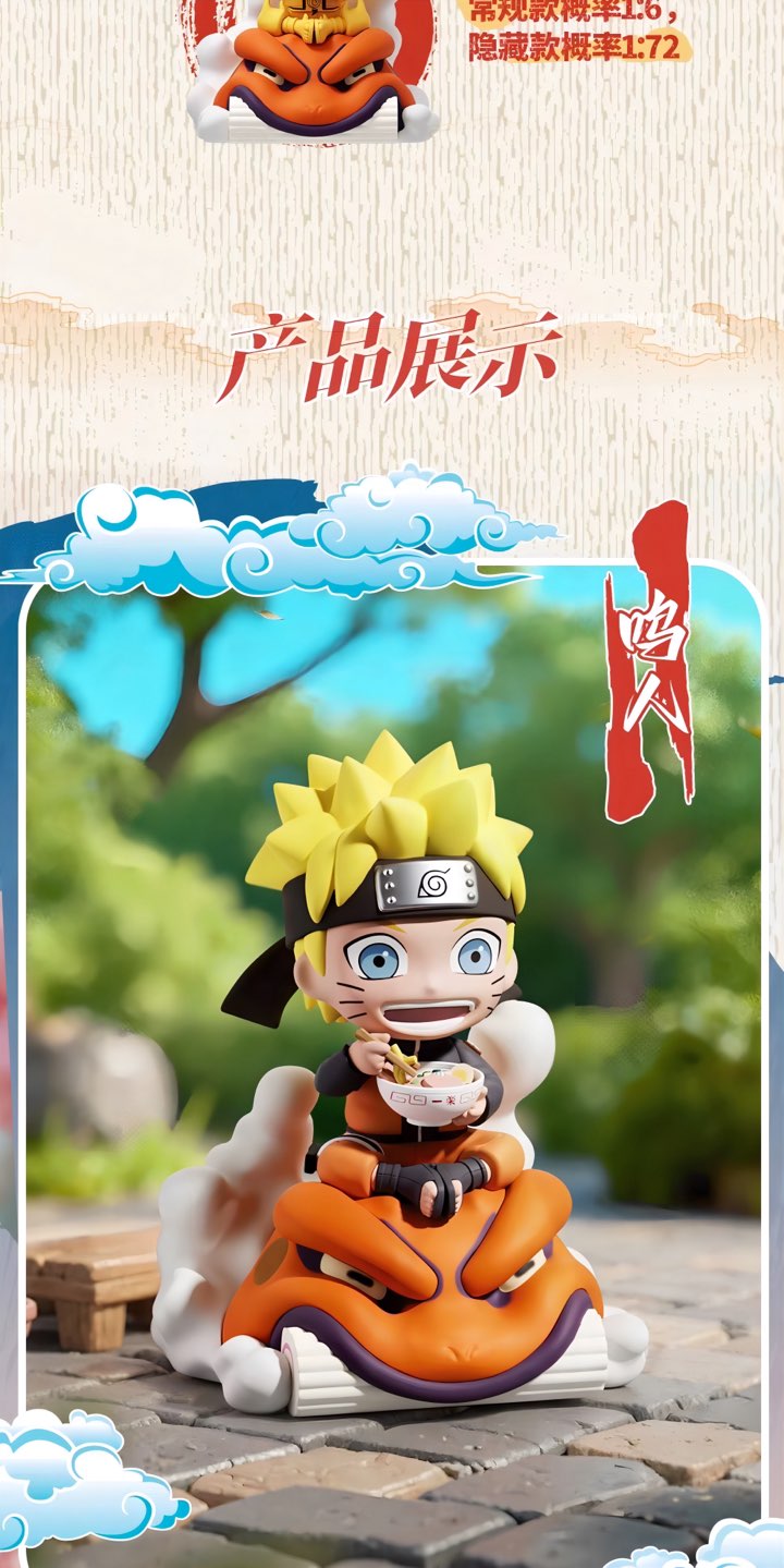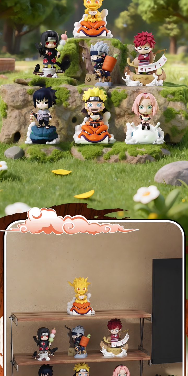 NARUTO -ナルト- 疾風伝の人気シーンを、一楽ラーメンをモチーフにデスクトップサイズで立体化したブラインドボックスフィギュアです。雲や背景台座の演出がしっかり入っていて、棚やデスクに置くだけでミニジオラマとして映えます。
